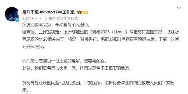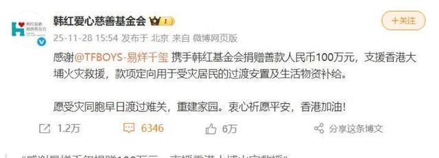易烊千玺这边没有开口说话,工作室也没有发表声明,更没有解释表演的具体情况,生日那天,他取消所有专辑发布和线下活动,第二天,韩红基金会发出公告,说易烊千玺匿名捐赠一百万元,用来支援香港大埔火灾的救援工作,这个做法很直接,你不问他演技的事,他就直接去做实际的事情,舆论方向一下子从讨论他配不配得奖转变成认为这个人确实做了一些实事。